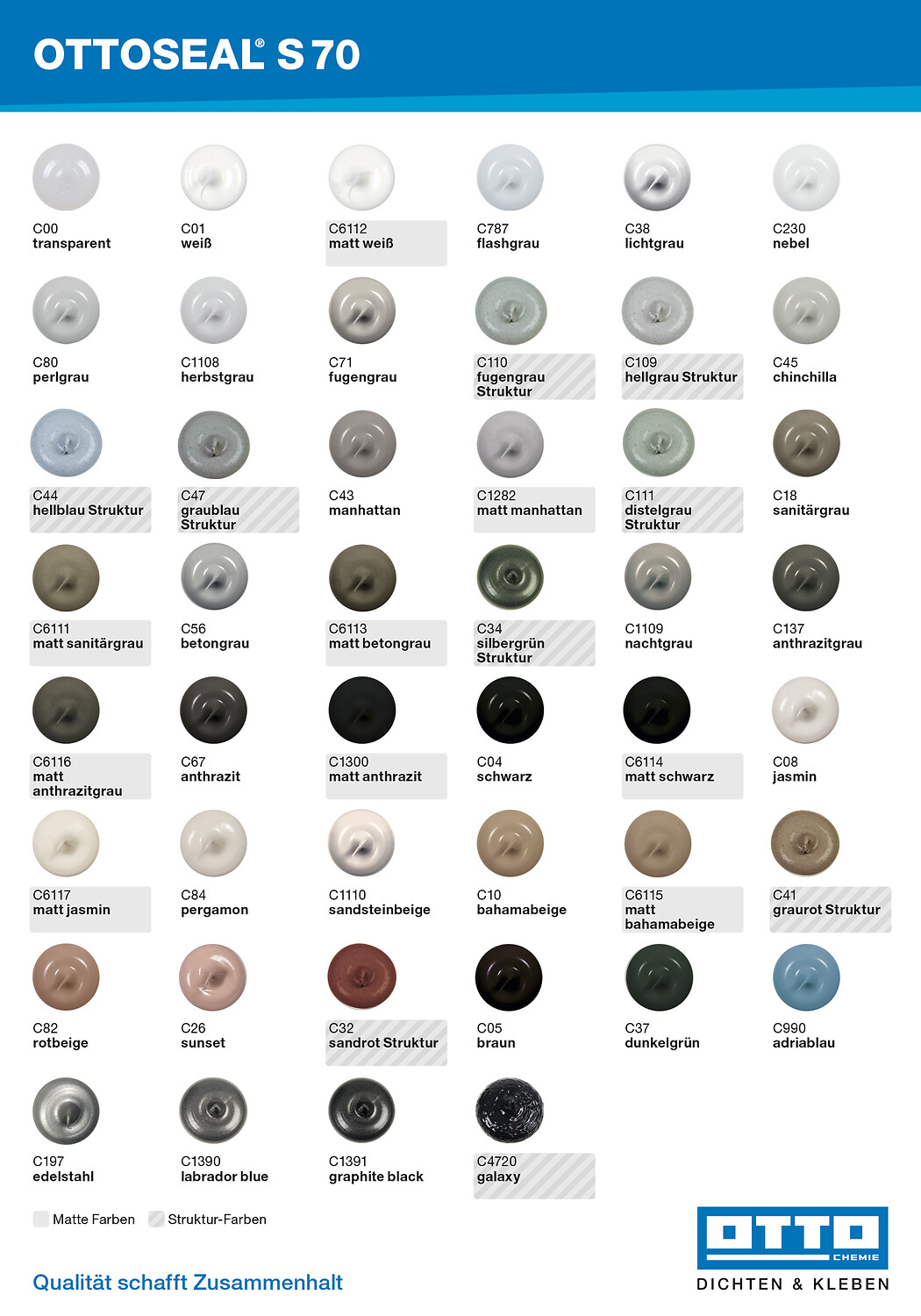 OTTOSEAL® S 70 ist die ideale Wahl für erfahrene Natursteinverarbeiter, spezialisierte Fassadenbauer und anspruchsvolle Heimwerker. Verfügbar in einer breiten Palette von Farben und Verpackungsgrößen, erfüllt es die verschiedensten Anforderungen und ästhetischen Wünsche.