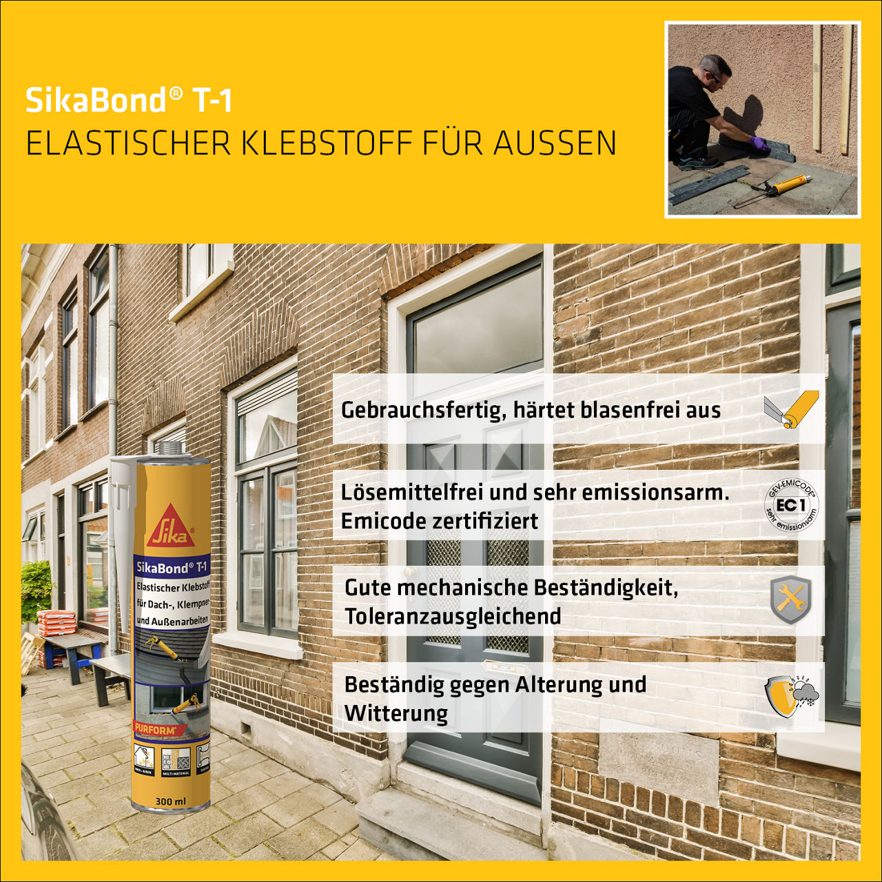 Produktinformationen "SikaBond T-1 Purform Elastischer Klebstoff für Aussen-, Dach & Klempnerarbeiten"