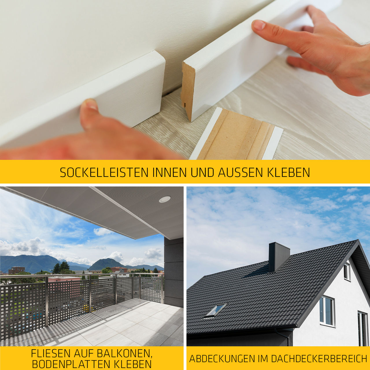 - Dualer Nutzen: Starker Montageklebstoff und Dichtstoff in einem Produkt – spart Platz im Werkzeugkoffer.