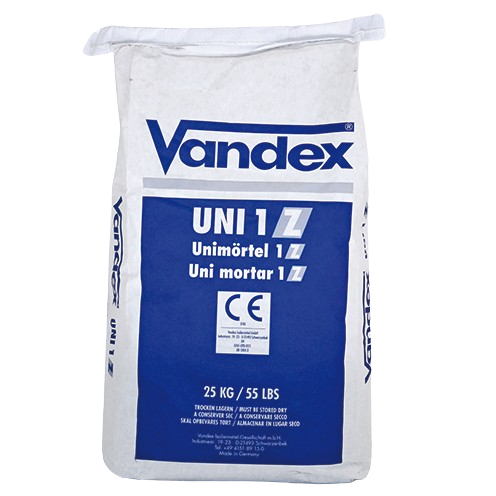 - Aufgrund seiner Zusammensetzung aus Zement, Quarz mit abgestufter Sieblinie und ausgewählten Additiven ist VANDEX UNIMÖRTEL 1 Z wasserdicht.